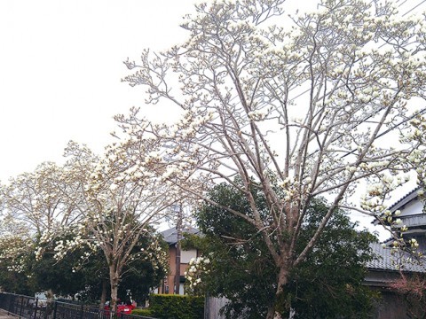 ハクモクレンが見ごろ 那智川沿いに咲く