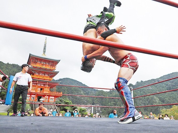 那智勝浦町の那智山青岸渡寺三重塔前の特設リンクで10月16日、「世界遺産プロレス熊野那智伝説」が行われた。 プロレス団体「ランズエンド」(崔領二〈さい・りょうじ〉代表)による奉納プロレスで、... 続きを読む