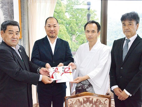 那智勝浦町築地のヤマサ𦚰口水産と三十三銀行が連名で、SDGs私募債の寄贈を、那智田楽保存会に行うことになり、その寄贈式が12日、熊野那智大社であった。同水産の𦚰口光太郎代表取締役が寄付金の目録を手渡した。同水産は別に単独でも、同... 続きを読む