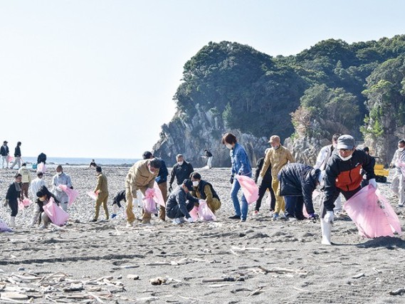 海岸の漂着ごみを集める参加者