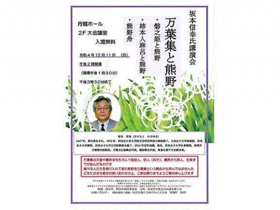 新宮市下本町の丹鶴ホール2階大会議室で12月11日(日)、奈良女子大学名誉教授で高岡市万葉歴史館(富山県高岡市)館長などを務める坂本信幸さんによる講演会「万葉集と熊野」が開催される。午後1時30分開場、午後2時開演、午後3時30... 続きを読む