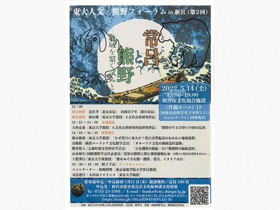 東京大学大学院人文社会系研究科・文学部と新宮市の主催、国際熊野学会と熊野歴史研究会の共催による、東大人文・熊野フォーラムin新宮(第2回)「常呂と熊野−地域を繋(つな)ぐ試みとして」が5月14日(土)午後1時~6時(... 続きを読む