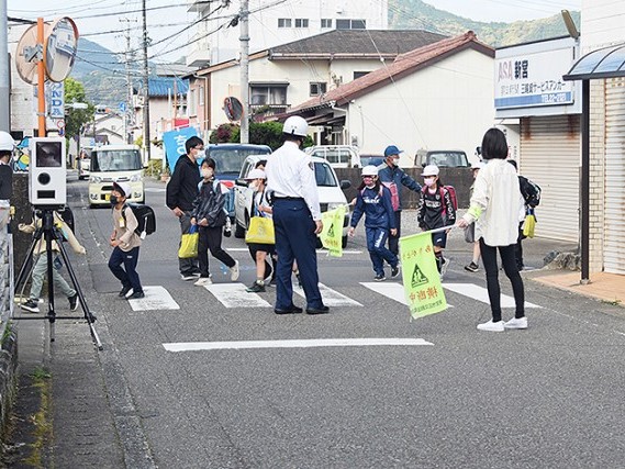 児童の安全見守りも 新宮署は12日、新宮市三輪崎、市立三輪崎小学校通用門前の