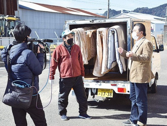 ふとん乾燥事業についてカメラの前で説明する東さん(左)とマエオカさん