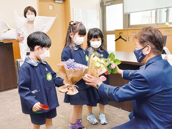 新宮市野田のマリア保育園の5歳児3人は26日、新宮警察署を訪問。山田守孝署長に花束を手渡し、日ごろの感謝を伝えた。 同園は毎年、花の日礼拝として花を捧げる礼拝を行っており、その後に普段お世話... 続きを読む