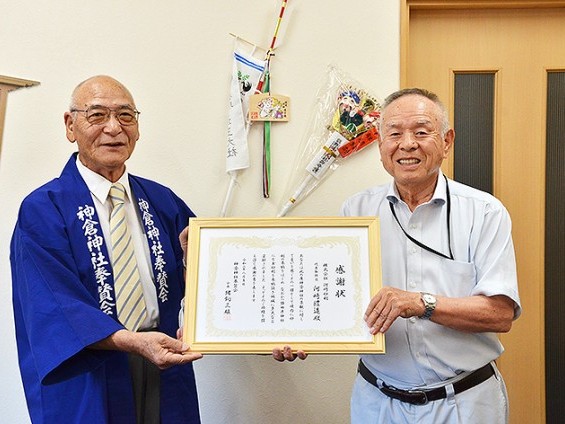 新宮市熊野川町東敷屋の株式会社河崎砂利から神倉神社への砂利の奉納に対する、神倉神社奉賛会の感謝状の贈呈式が22日、同社であった。同会から猪飼三雄会長など4人が訪れ、河崎禮造代表取締役に感謝状を手渡した。 ... 続きを読む