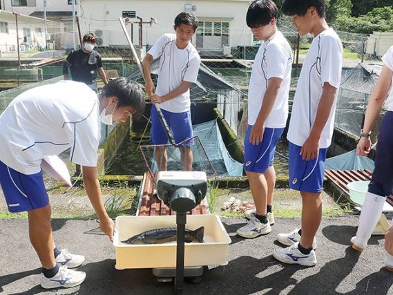 近大附属新宮高校は28日、2年生15人に対し、新宮市高田にある近大水産研究所新宮実験場で水産実習を実施。同実験場長の稻野俊直准教授からアマゴの生体について学んだ後、同実験場の生簀(いけす)で育てているチョウザメとアマゴの重さを計... 続きを読む