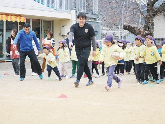 新宮市立佐野保育所は12日、講師に新宮ラグビーフットボールクラブ(新宮RFC・鈴木雄一代表)の5人を招き、同園でラグビーの体験会を行った。4~5歳児46人は、ボールを持って園庭を走り、はじめてのラグビーを体験した。 ... 続きを読む